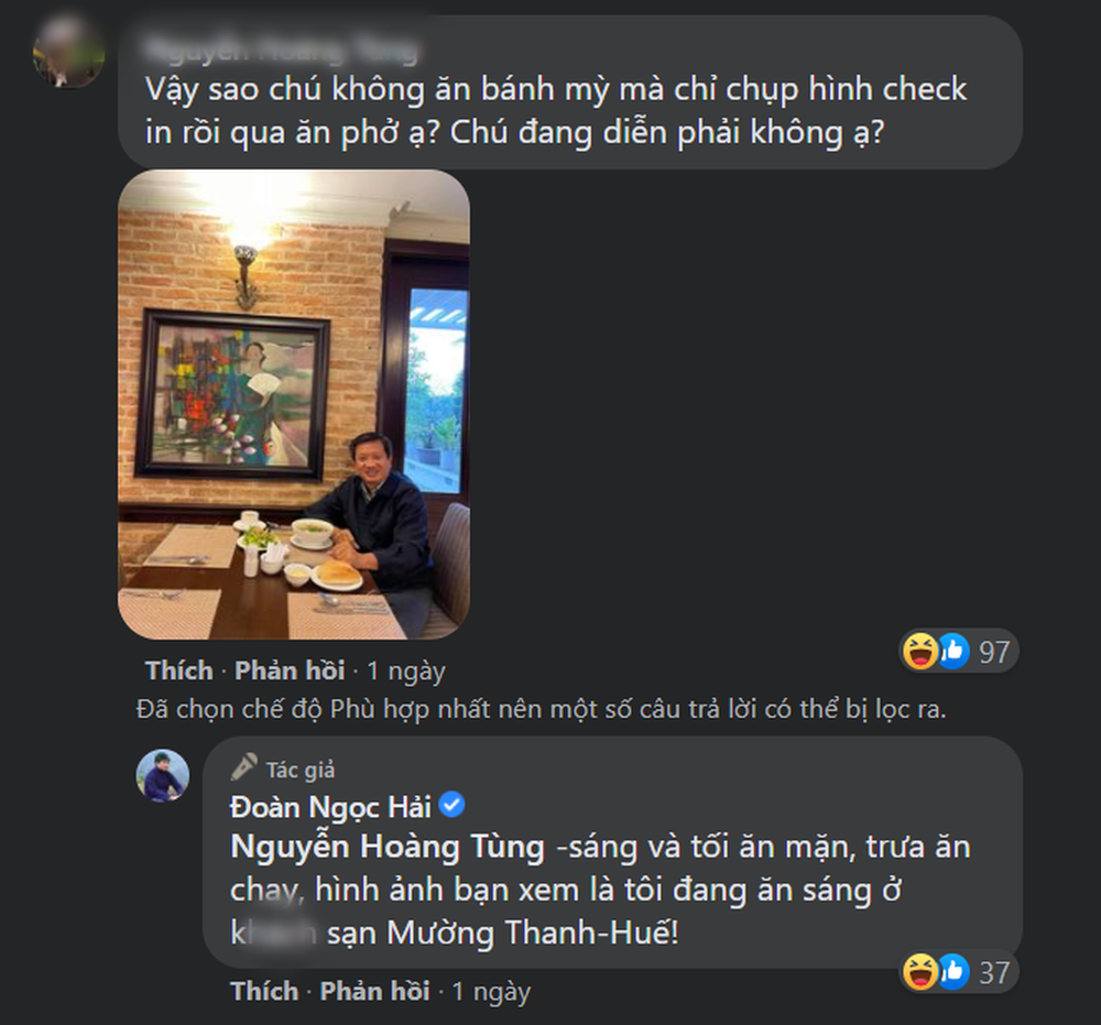 Trước những tranh cãi của dư luận ông Đoàn Ngọc Hải cũng không ngại ngần đáp trả thắng thắn. Cụ thể, khi một tài khoản đặt rõ câu hỏi: "Vậy chú không ăn bánh mì mà chỉ chụp hình check in rồi qua ăn phở ạ? Chú đang diễn phải không ạ?". Ông Hải trả lời thẳng luôn: "Sáng và tối ăn mặn, trưa ăn chay, hình ảnh bạn xem là tôi đang ăn sáng ở khách sạn Mường Thanh-Huế".