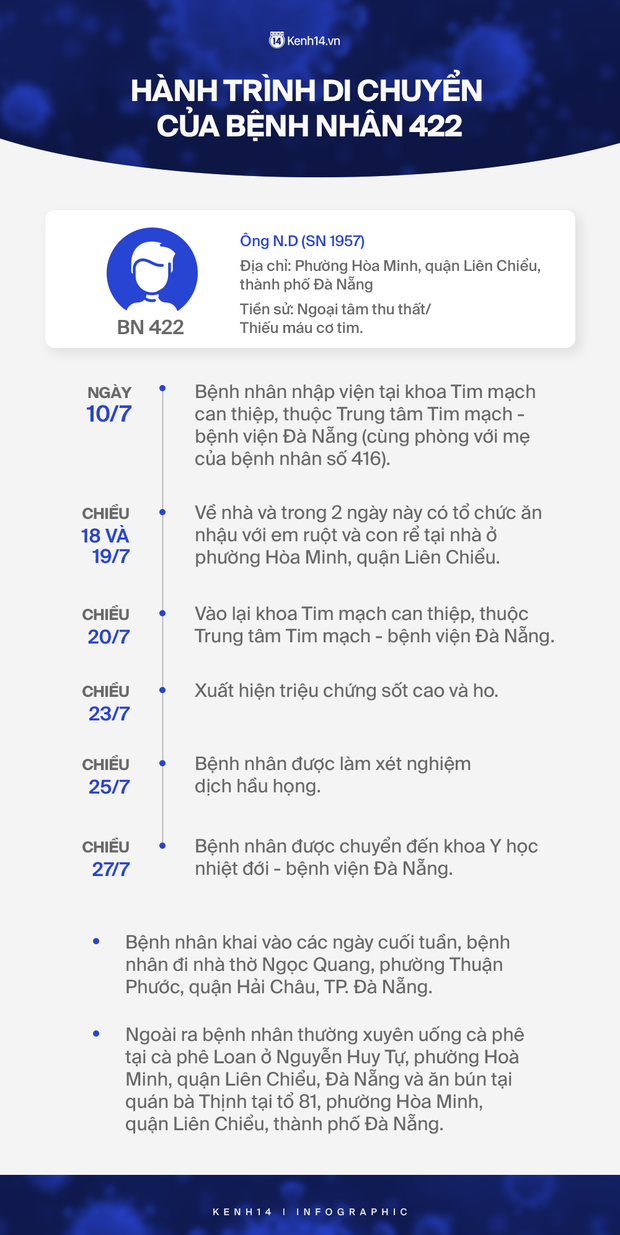 Trước khi phát hiện dương tính với Covid-19, ngày 10/7/2020, bệnh nhân nhập viện tại khoa Tim mạch can thiệp, thuộc Trung tâm Tim mạch - bệnh viện Đà Nẵng (cùng phòng với mẹ của bệnh nhân số 416).