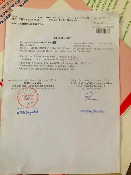 Tại đây, anh D. được chụp cộng hưởng từ đốt sống cổ và được chẩn đoán thoát vị đĩa đệm, nghi u tủy cổ. Sau đó, anh được hướng dẫn chuyển tuyến lên Bệnh viện Bạch Mai điều trị.