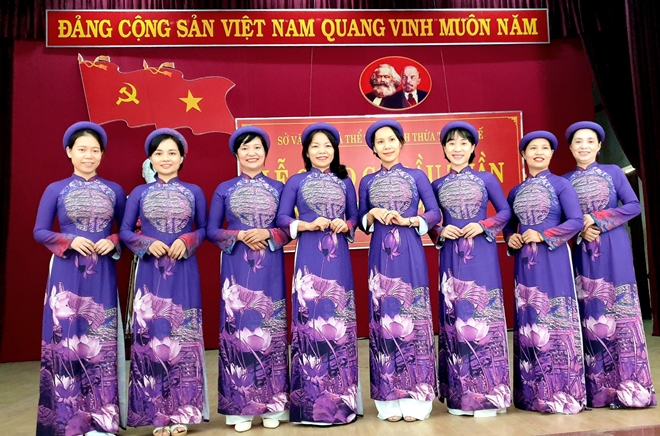 Trong đó, các cán bộ nữ mặc áo dài màu tím đặc trưng, có họa tiết hoa sen còn cán bộ nam mặc áo dài ngũ thân với tông nền áo màu xanh đậm, quần trắng.