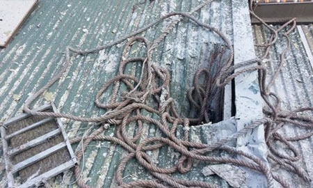 Tại hiện trường, mái tôn nơi xảy ra sự việc bị thủng một lỗ lớn, xung quanh có rất nhiều dây thừng, lọ sơn cùng những dụng cụ lao động.