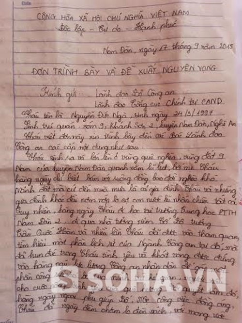 Bức tâm thư của Ngà viết gửi lãnh đạo Bộ Công an với những tâm sự mong muốn mình sẽ được chiếu cố để xét duyệt vào trường. |