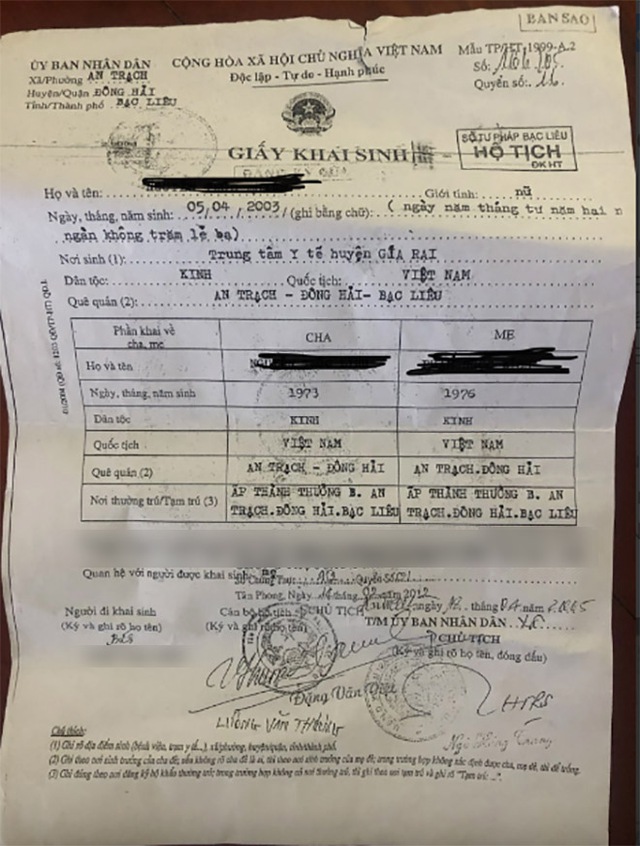 Ngoài ra còn 1 trường hợp khác có cha là người Hàn Quốc, mang quốc tịch Hàn Quốc cũng được cấp giấy khai sinh sai quy định tại huyện Đông Hải, tỉnh Bạc Liêu.