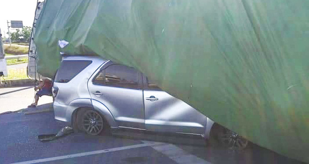 Sau đó, anh quay lại chiếc xe con 7 chỗ bị xe tải lật nghiêng đè trúng rồi dùng cẩu nhấc nóc xe ô tô con cho người bị nạn trong xe chui ra.