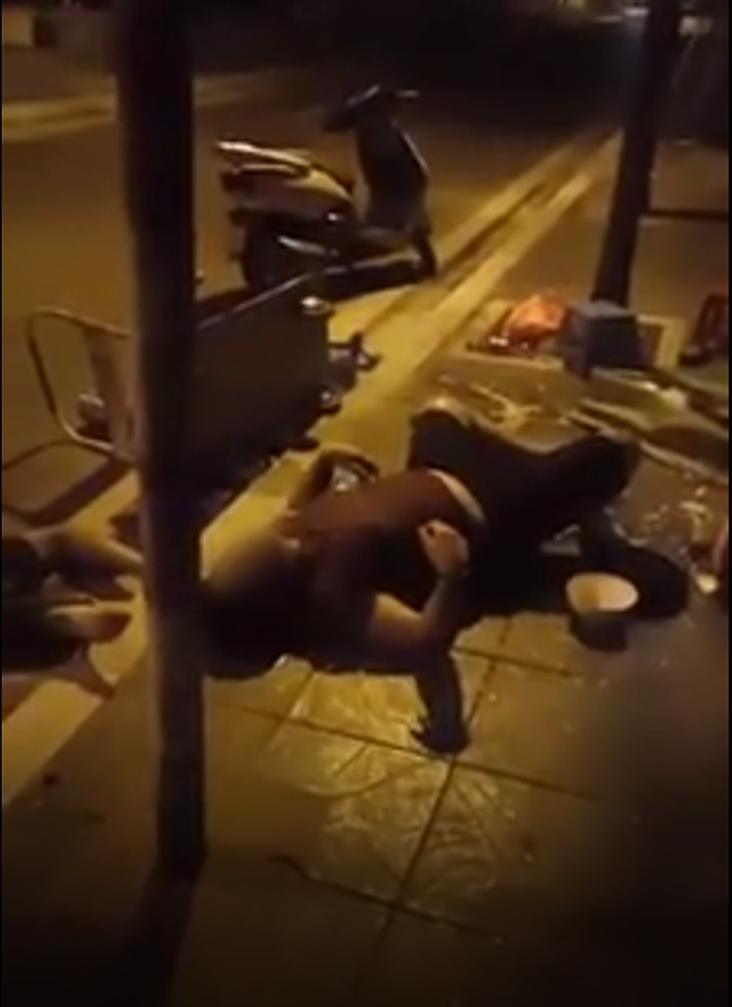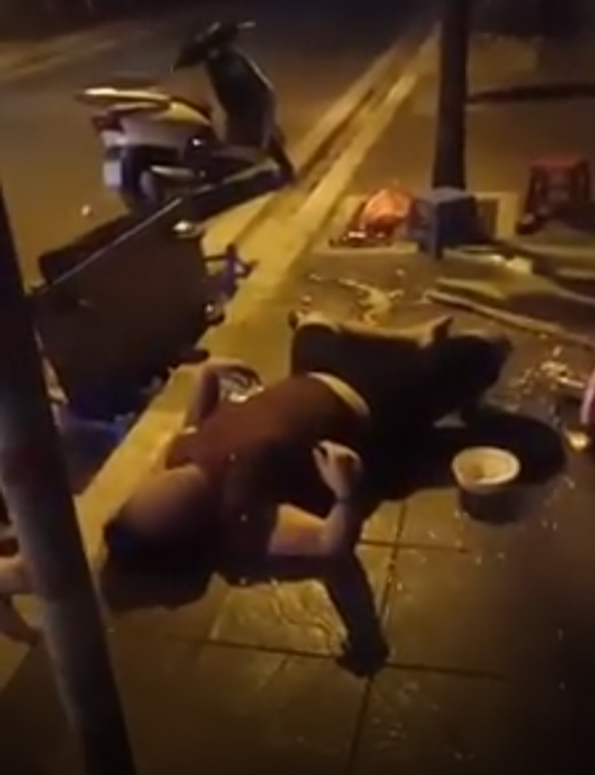 Ngay sau đó, 1 thanh niên nằm vật ra đường còn liên tục mếu máo kêu cứu, "cứu...cứu... cứu ... cứu tao, chúng mày cứu tao. Thằng nào... cứu tao. Mày giết tao à". Sau đó liên tục chửi bậy bằng giọng mếu máo và chân tay múa máy khắp nơi.