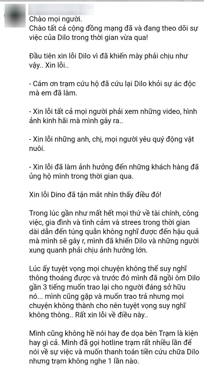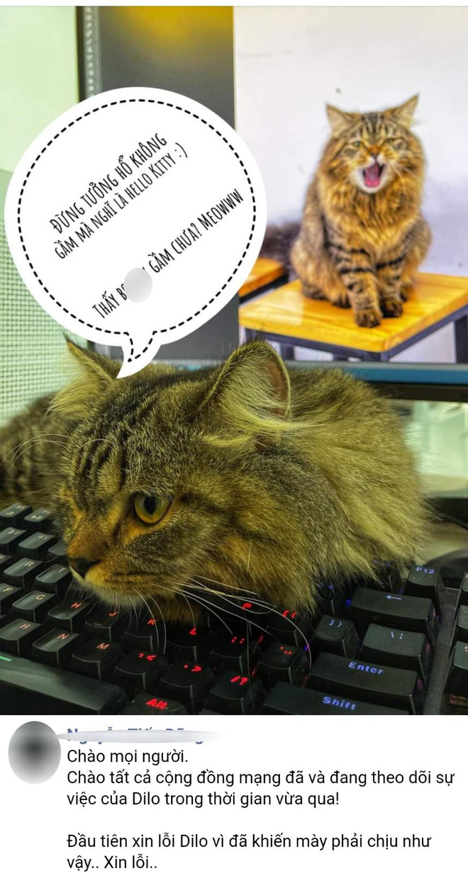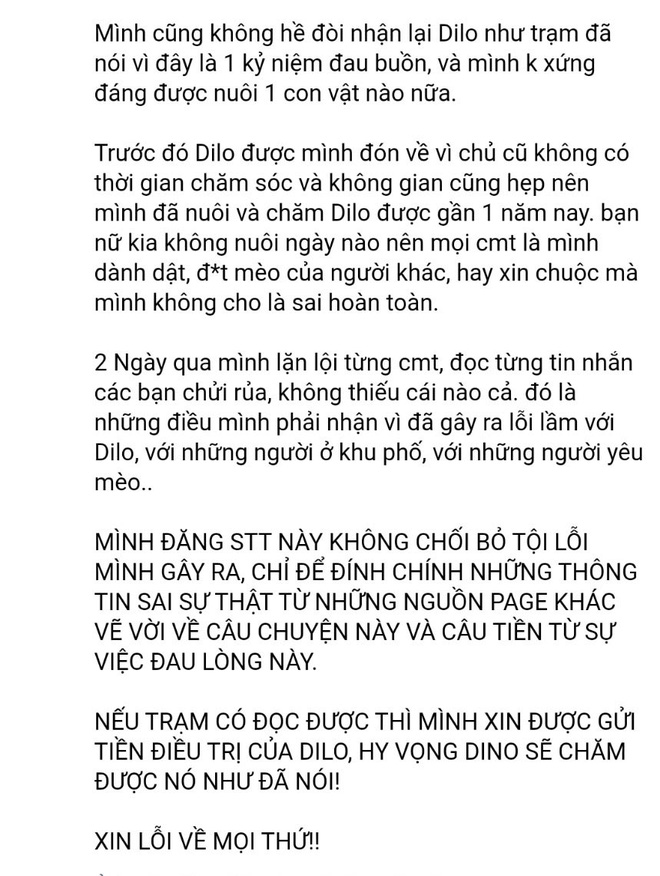 "2 ngày qua mình lặn lội từng cmt, đọc từng tin nhắn các bạn chửi rủa, không thiếu cái nào cả. Đó là những điều mình phải nhận vì đã gây ra lỗi lầm với Dilo, với những người ở khu phố, với những người yêu mèo" - anh D.T. chia sẻ.