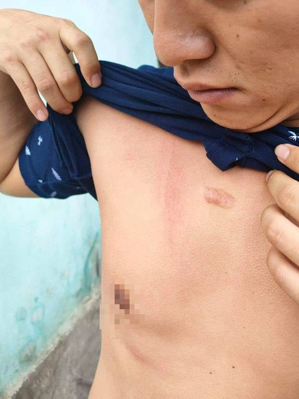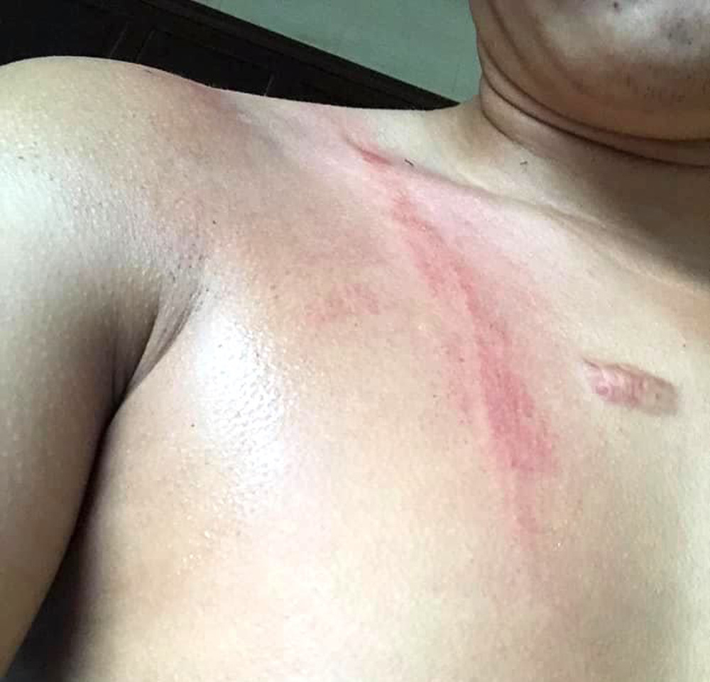 Khi kiểm tra trên ngực, anh P. thấy có một vết bỏng đỏ kéo dài khoảng 20cm.