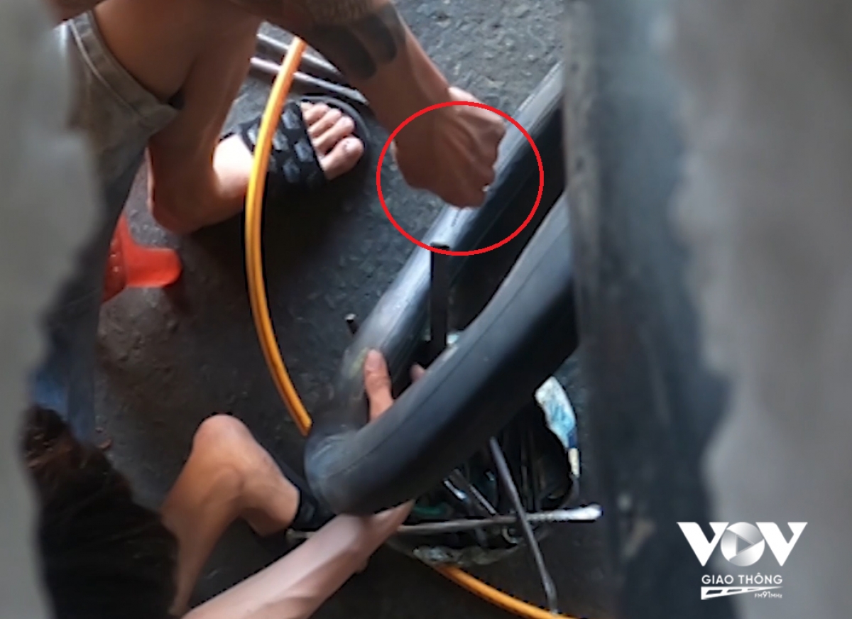 Chỉ cách đó vài trăm met. Một tiệm sửa xe khác cũng có một “đạo cụ” rất đặc biệt. Trong lúc chủ nhân của chiếc xe lơ là, không chú ý, hai thanh niên này đã rạch chiếc lốp thành một đường thẳng đẹp miễn chê.