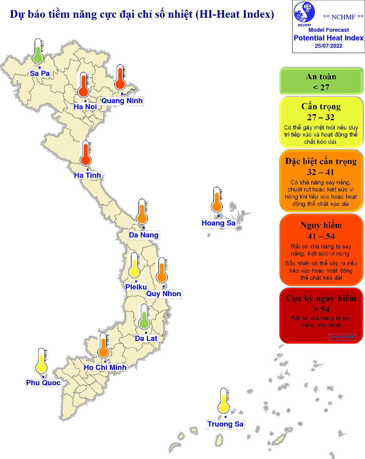 - Từ Thanh Hóa đến Phú Yên có nắng nóng từ ngày 27-30/7. Khu vực từ Đà Nẵng đến Bình Thuận thời kỳ từ 27/7-03/8 có mưa rào và dông rải rác, cục bộ có mưa to.