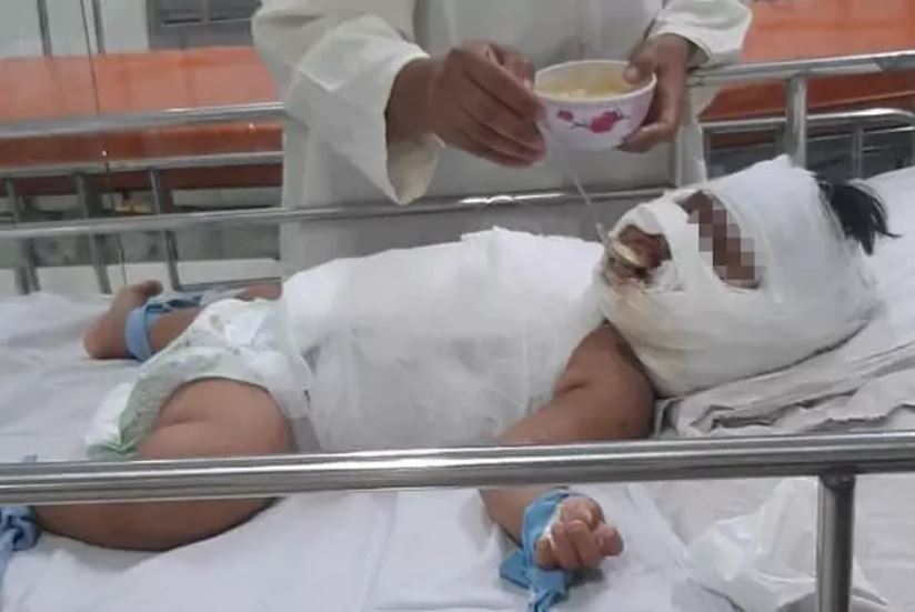 Tai nạn thương tâm khiến nhiều vùng cơ thể bệnh nhi bị bỏng nặng, cả đôi mắt cũng bị nhúng vào nước nóng.