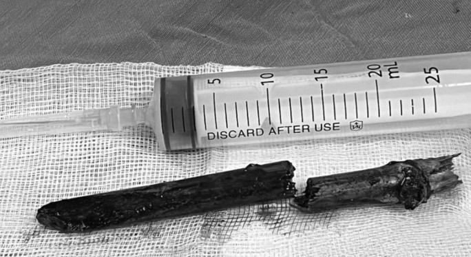 Sau hơn một giờ phẫu thuật cấp cứu, các bác sĩ đã lấy được dị vật là một thanh tre dài khoảng 15 cm, được xác định đâm lệch động mạch cảnh khoảng 5 cm. Đây là điều rất may mắn với bệnh nhân.