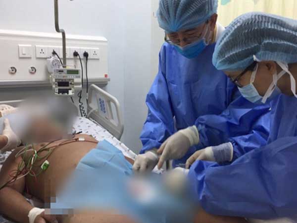 Lúc đó, bé P đã tím tái, hôn mê, phù phổi cấp, bọt hồng trào ra ống nội khí quản. Bé được các bác sĩ cho thở máy, chống co giật, đặt catheter đo huyết áp xâm lấn, đo áp lực tĩnh mạch trung tâm để sử dụng thuốc vận mạch, điều chỉnh nước điện giải và cho kháng sinh điều trị viêm phổi hít.