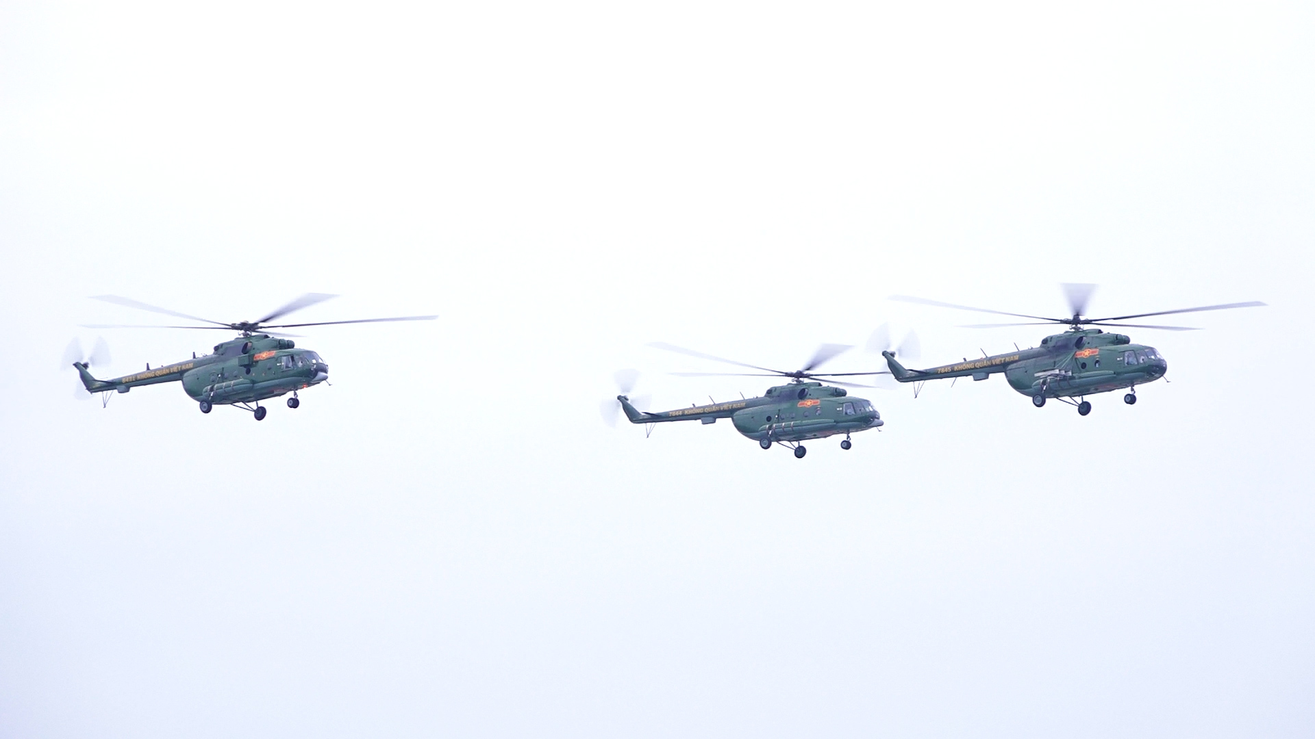 Hai biên đội trực thăng 3 chiếc và 4 chiếc bay trước các lượt bay của SU-30MK2, diễu qua khán đài của Triển lãm Quốc phòng được dựng trong khuôn viên sân bay Gia Lâm.