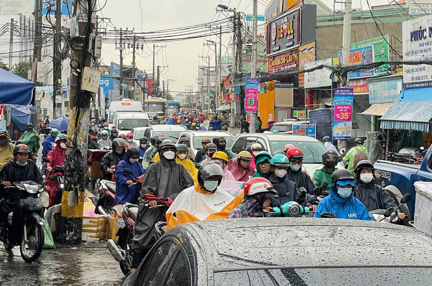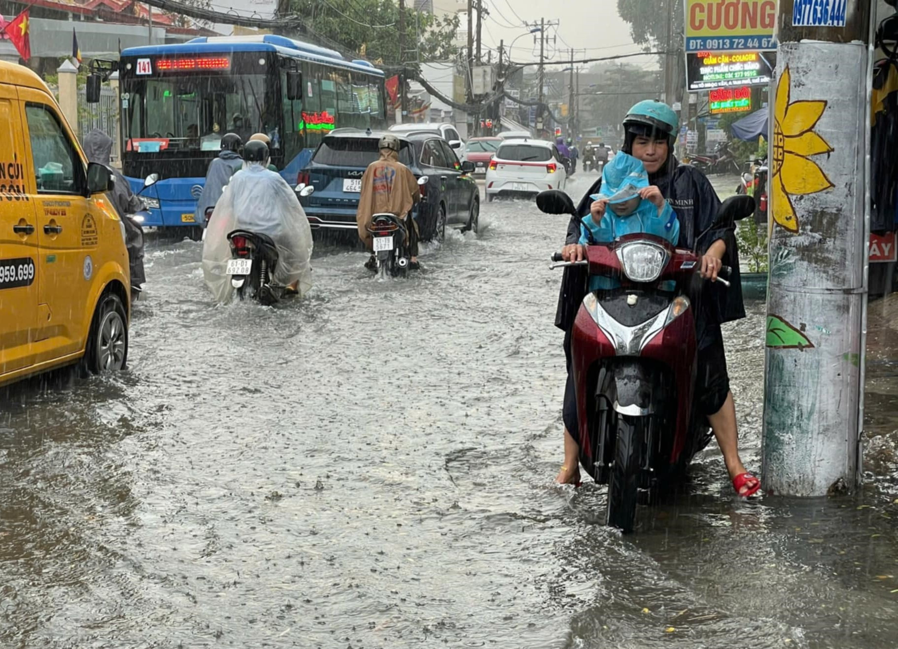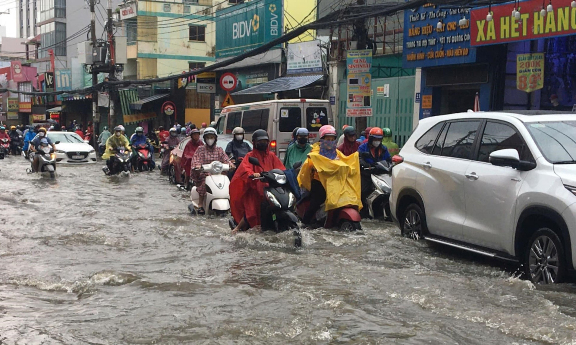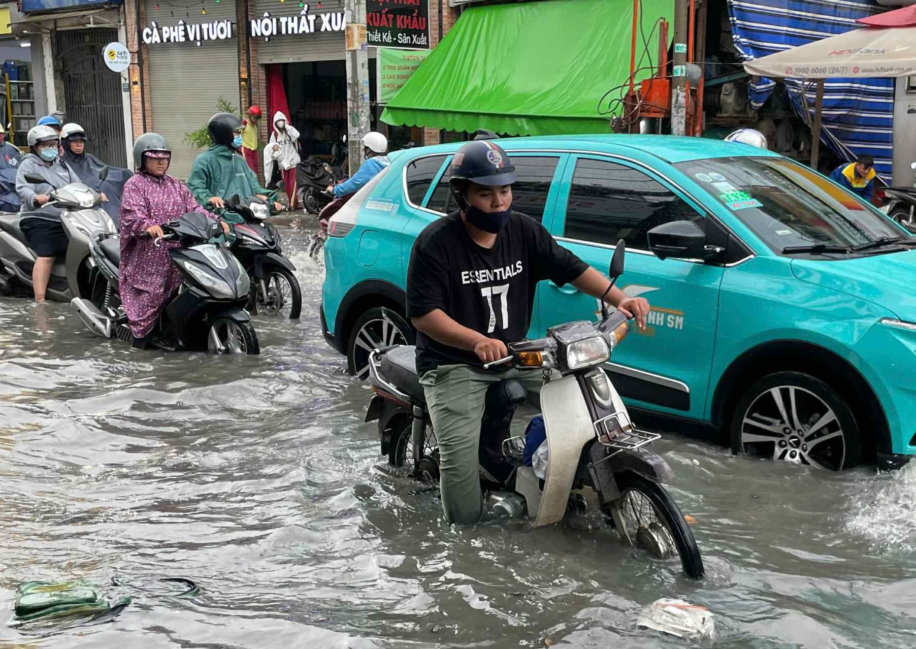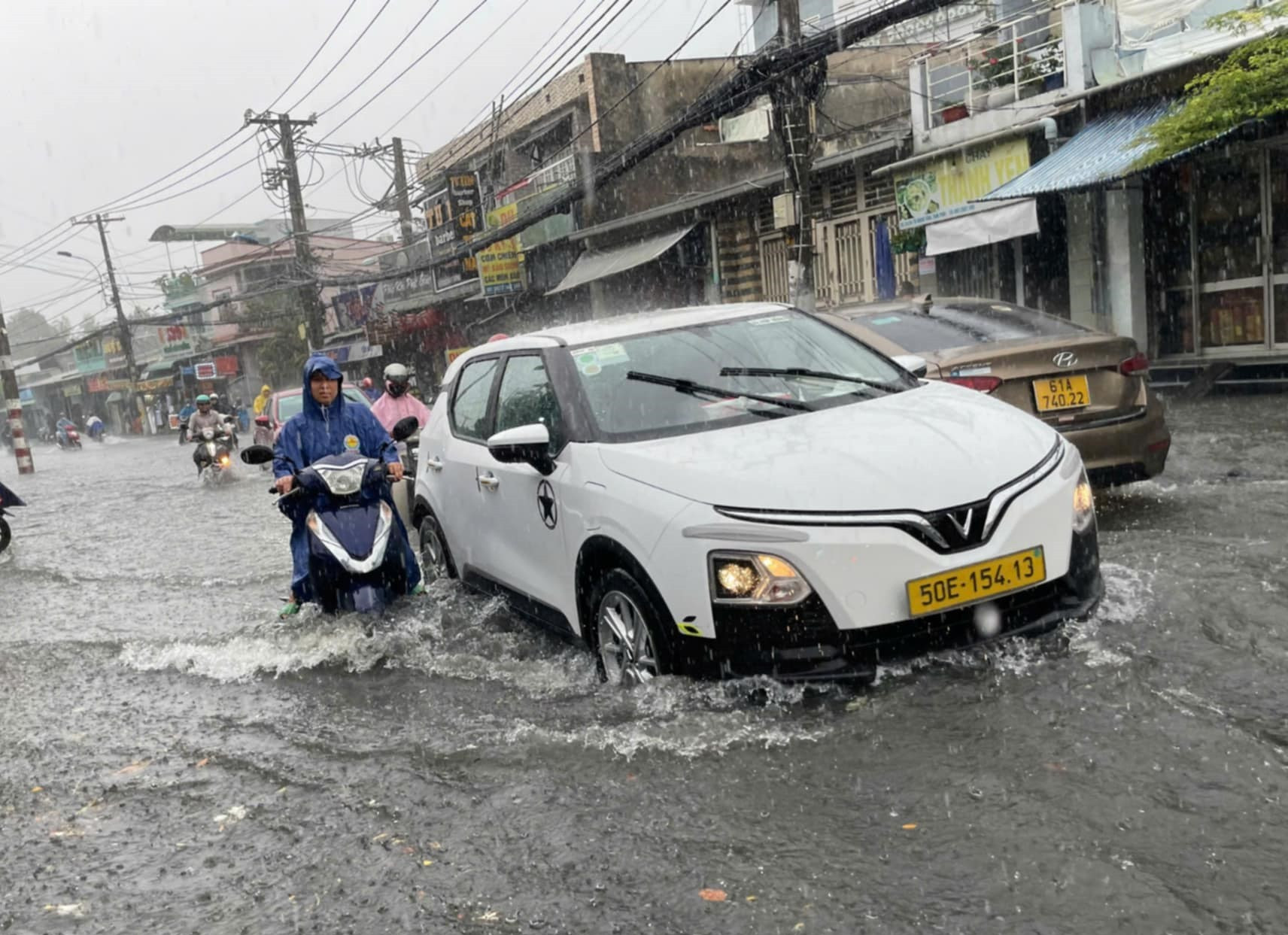 Tại TP Thủ Đức nhiều tuyến đường ngập sâu đến nửa mét như Tô Ngọc Vân, Lê Văn Việt... khiến người dân đi lại khó khăn.