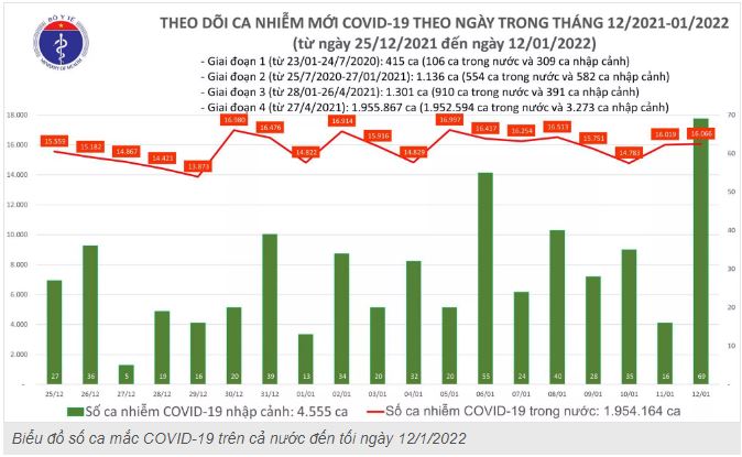- Tính từ 16h ngày 11/01 đến 16h ngày 12/01, trên Hệ thống Quốc gia quản lý ca bệnh Covid-19 ghi nhận 16.135 ca nhiễm mới, trong đó 69 ca nhập cảnh và 16.066 ca ghi nhận trong nước (tăng 47 ca so với ngày trước đó) tại 60 tỉnh, thành phố (có 10.889 ca trong cộng đồng).
