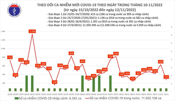 Bộ Y tế cho biết từ 16 giờ ngày 11-11 đến 16 giờ ngày 12-11, trên Hệ thống quốc gia quản lý ca bệnh COVID-19 ghi nhận 277 ca nhiễm, giảm 353 ca so với ngày hôm qua.