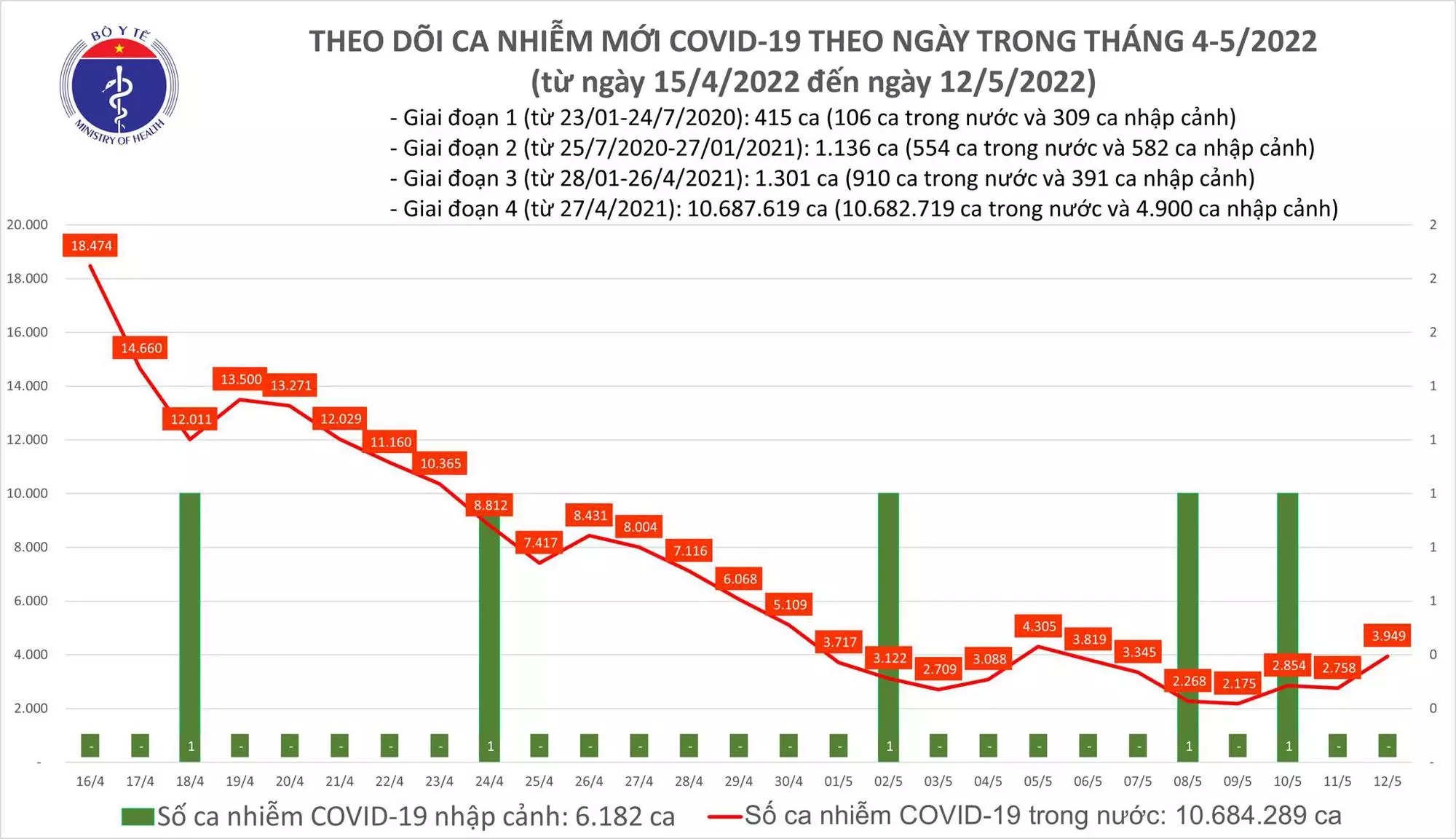 - Tính từ 16h ngày 11/5 đến 16h ngày 12/5, trên Hệ thống Quốc gia quản lý ca bệnh COVID-19 ghi nhận 3.949 ca nhiễm mới đều ghi nhận trong nước (tăng 1.191 ca so với ngày trước đó) tại 55 tỉnh, thành phố (có 3.294 ca trong cộng đồng).