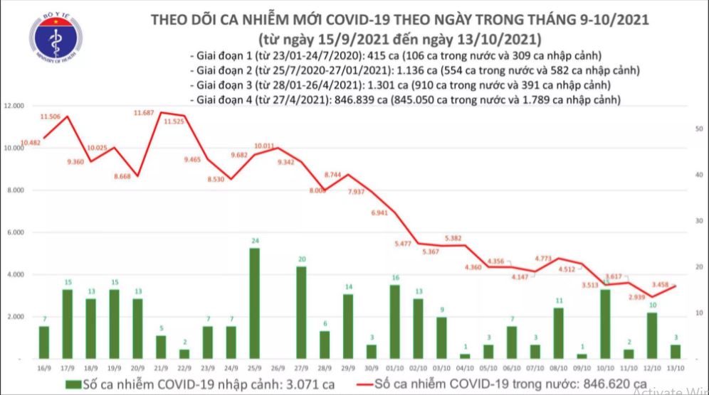 - Tính từ 17h ngày 12/10 đến 17h ngày 13/10, trên Hệ thống Quốc gia quản lý ca bệnh COVID-19 ghi nhận 3.461 ca nhiễm mới, trong đó 03 ca nhập cảnh và 3.458 ca ghi nhận trong nước (tăng 519 ca so với ngày trước đó) tại 47 tỉnh, thành phố (có 1.432 ca trong cộng đồng).