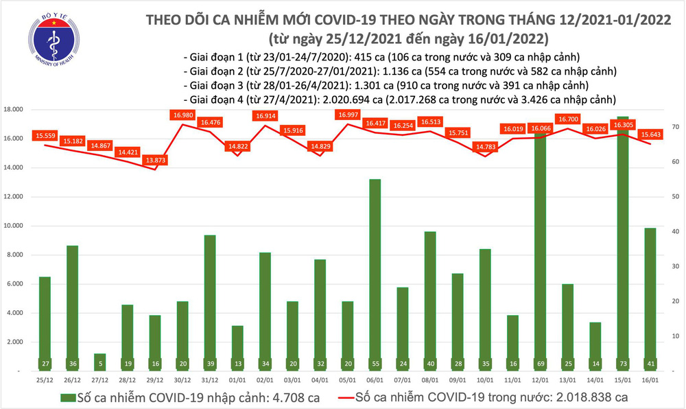 17/01/2022 01:03Ngày 16/1, có thêm 15.684 ca Covid-19 mới, số tử vong ở TP.HCM tiếp tục giảm