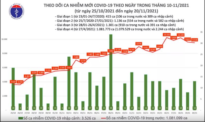 Tính từ 16h ngày 19/11 đến 16h ngày 20/11, trên Hệ thống Quốc gia quản lý ca bệnh COVID-19 ghi nhận 9.531 ca nhiễm mới, trong đó 13 ca nhập cảnh và 9.518 ca ghi nhận trong nước (giảm 99 ca so với ngày trước đó) tại 60 tỉnh, thành phố (có 4.776 ca trong cộng đồng).