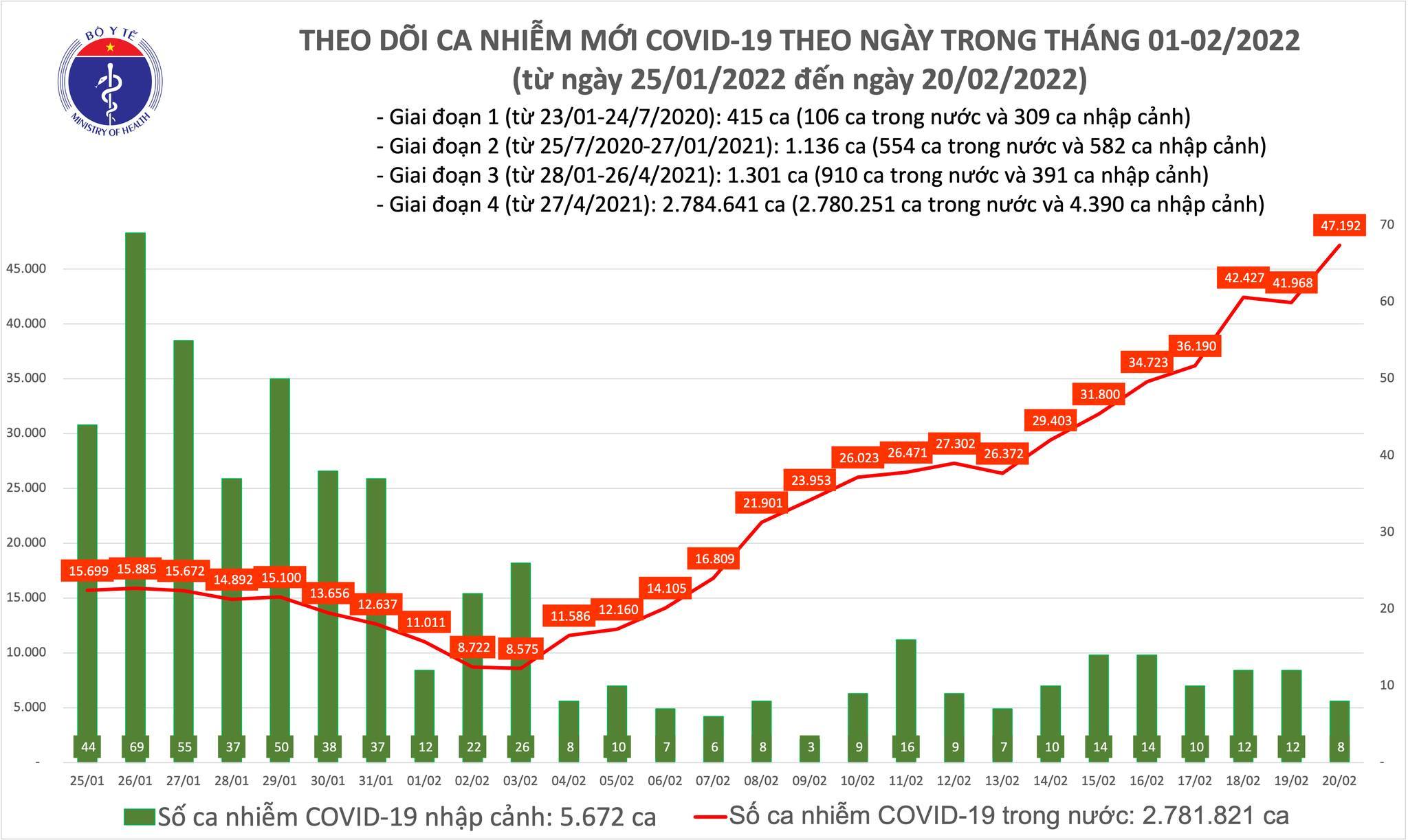 21/02/2022 00:55Ngày 20/2, cả nước ghi nhận 47.200 ca COVID-19 mới, Hà Nội vượt 5.000 ca