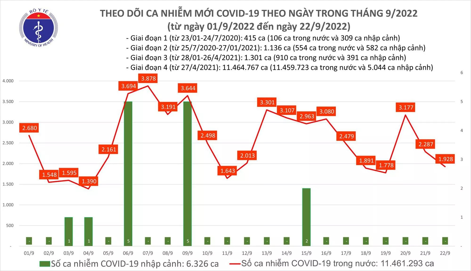 23/09/2022 00:55Ngày 22/9, cả nước ghi nhận gần 2.000 ca mắc COVID-19 mới, 123 F0 nặng đang điều trị