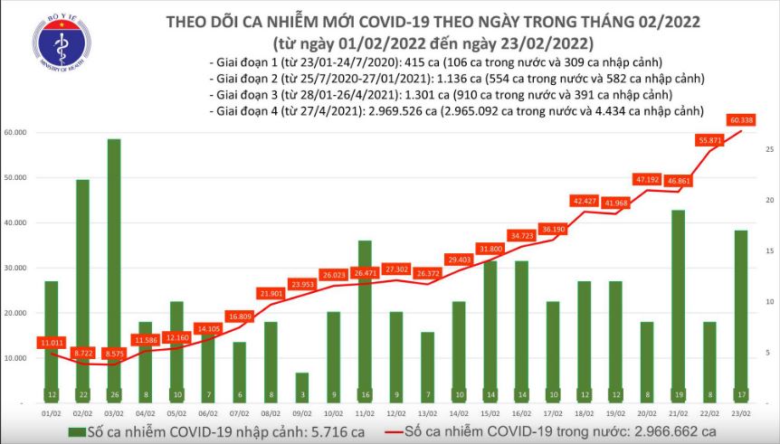 24/02/2022 00:57Ngày 23/2: Số mắc Covid-19 mới trên cả nước tăng vọt lên 60.355 ca, Hà Nội tiếp tục lập đỉnh mới