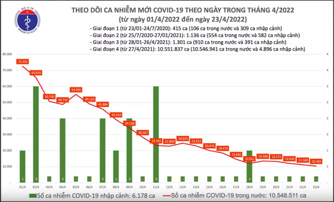 - Tính từ 16h ngày 22/4 đến 16h ngày 23/4, trên Hệ thống Quốc gia quản lý ca bệnh Covid-19 ghi nhận 10.365 ca nhiễm mới, tất cả đều ghi nhận trong nước (giảm 795 ca so với ngày trước đó) tại 59 tỉnh, thành phố (có 7.412 ca trong cộng đồng).