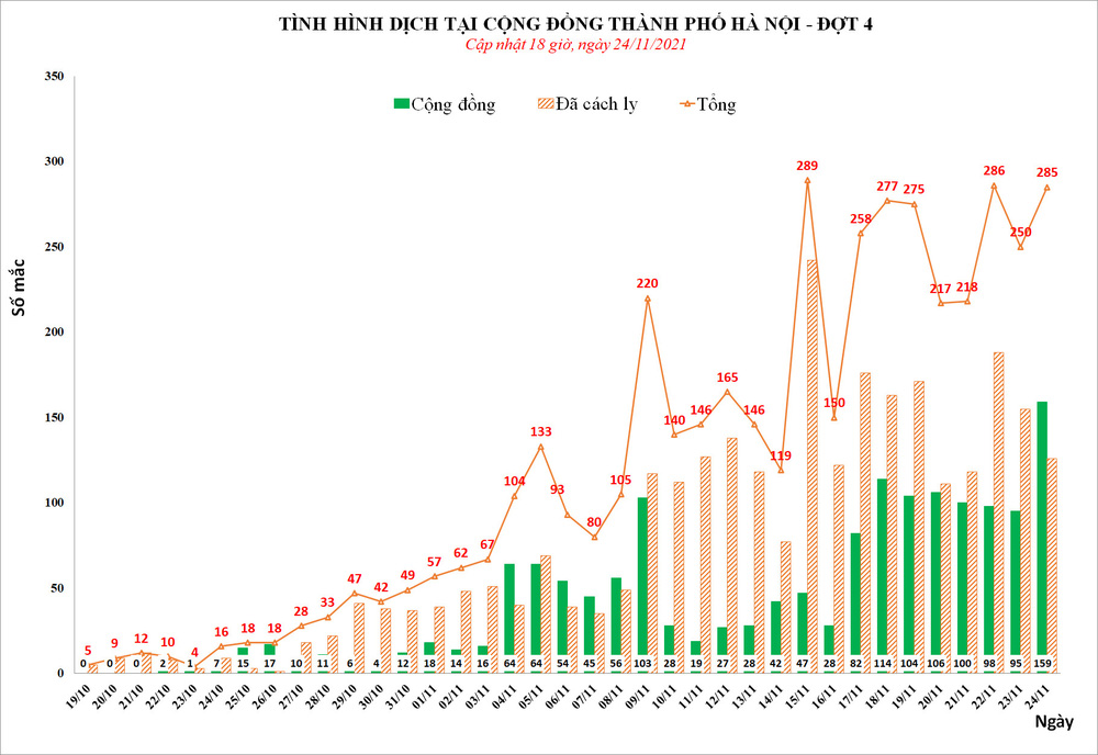 Ngày 24/11, Trung tâm kiểm soát bệnh tật (CDC) Hà Nội cho biết, trong ngày, thành phố phát hiện thêm 285 ca mắc Covid-19, trong đó có 159 ca cộng đồng, 115 ca ở khu cách ly và 11 ca ở khu phong tỏa.