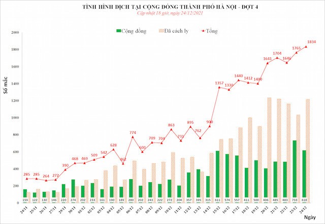 25/12/2021 01:17Ngày 24/12, số ca mắc Covid-19 của Hà Nội tiếp tục tăng cao, trong đó ghi nhận 618 ca nhiễm ngoài cộng đồng