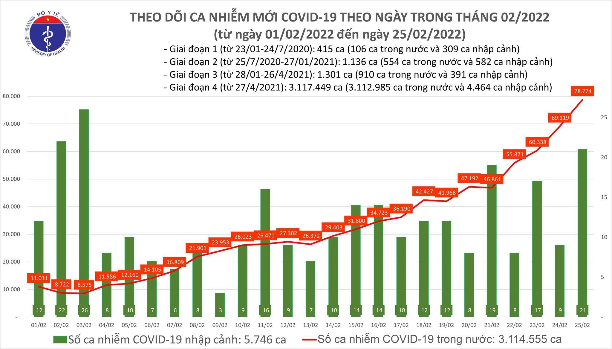 26/02/2022 00:59Ngày 25/2: Cả nước thêm 78.795 ca nhiễm mới, Hà Nội tiến sát mốc 10.000 F0
