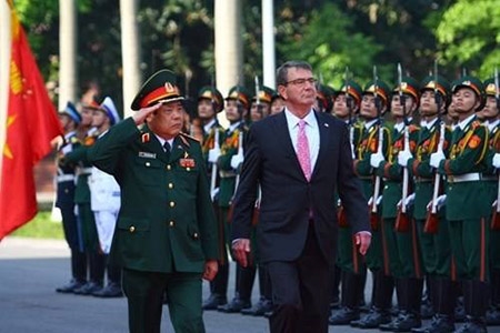 Đại tướng Phùng Quang Thanh, Bộ trưởng Quốc phòng (trái) và Bộ trưởng Quốc phòng Mỹ Ashton Carter trong lễ duyệt đội danh dự nhân dịp ông Ashton Carter thăm chính thức Việt Nam vào tháng 6.2015 - Ảnh: Trường Sơn |