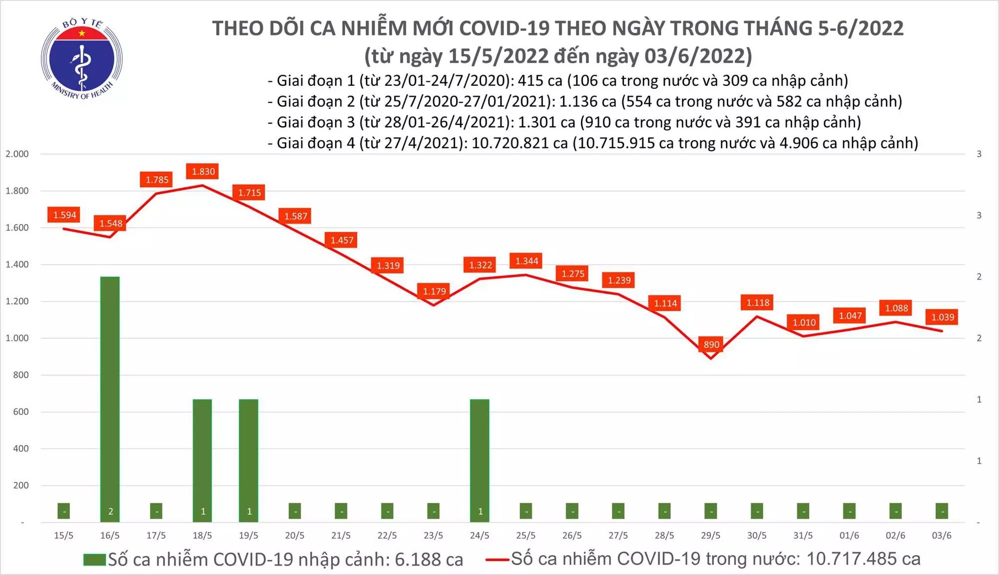 04/06/2022 01:17Ngày 3/6, thêm 1.039 ca mắc COVID-19 mới, không có trường hợp tử vong