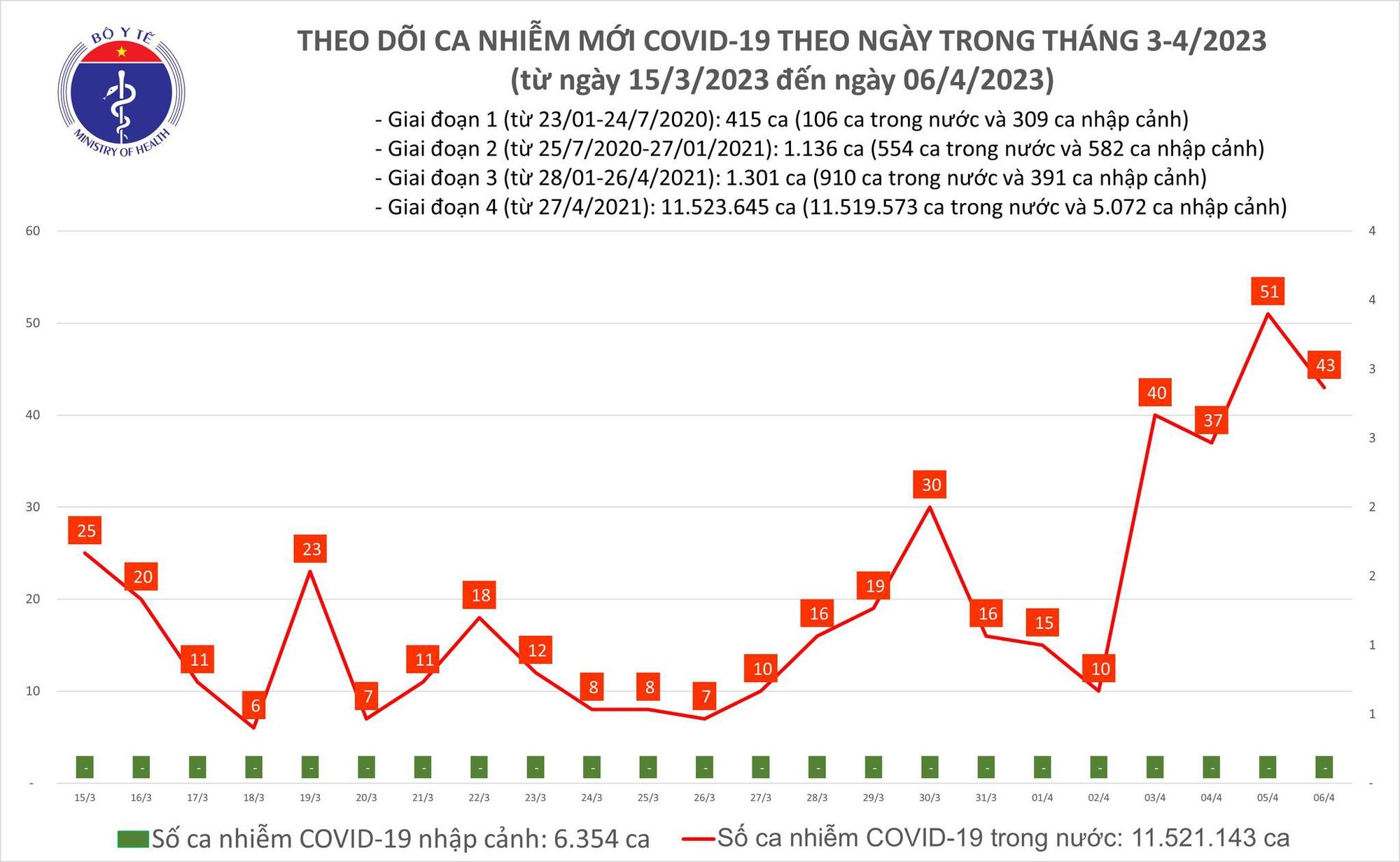 07/04/2023 00:58Ngày 6/4: Cả nước ghi nhận 43 ca COVID-19 mới, xuất hiện bệnh nhân nặng thở máy
