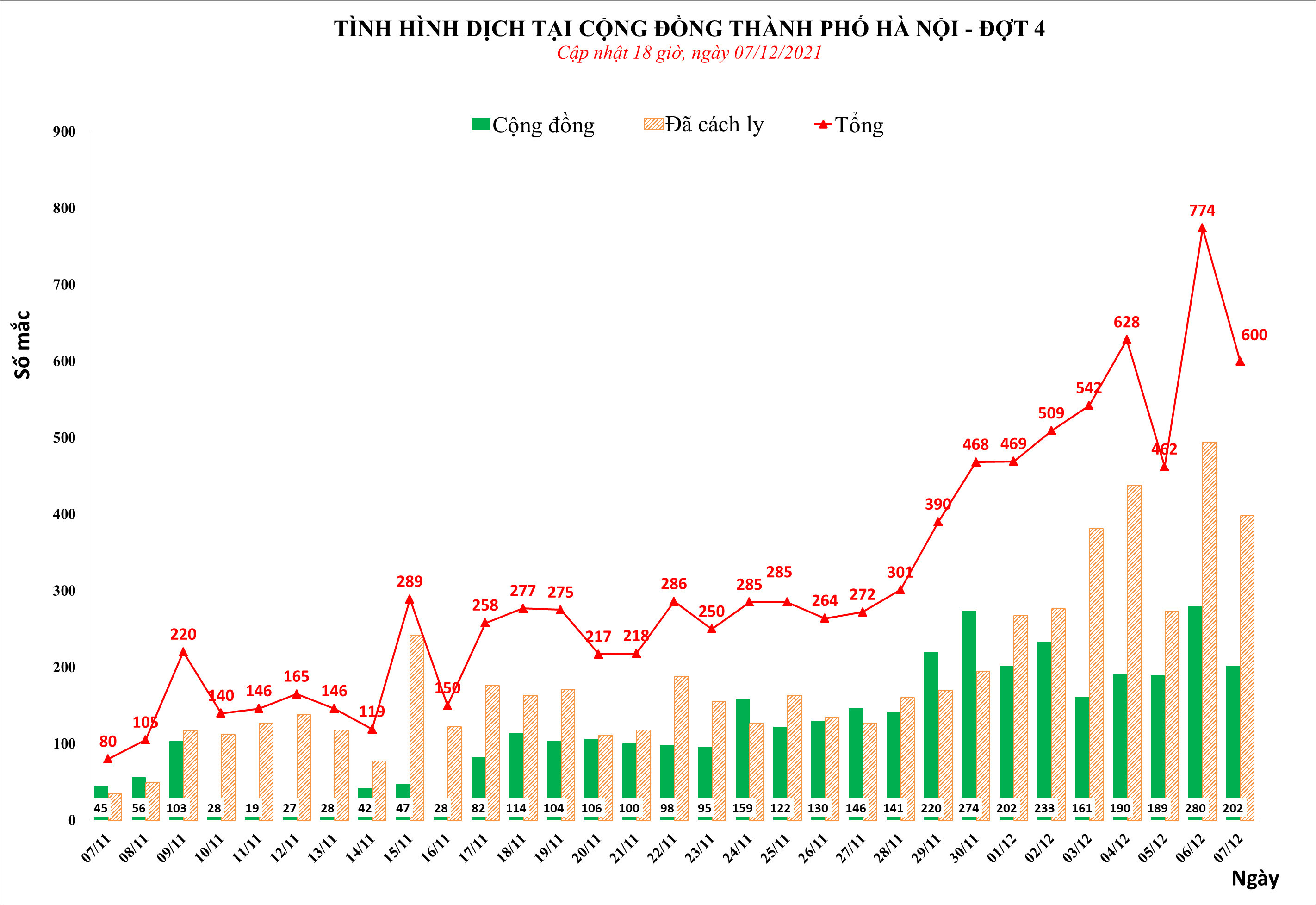 Cộng dồn số mắc tại Hà Nội trong đợt dịch 4 (từ ngày 29/4/2021): 14.546 ca trong đó số mắc ghi nhận ngoài cộng đồng 5.604 ca, số mắc là đối tượng đã được cách ly 8.942 ca.