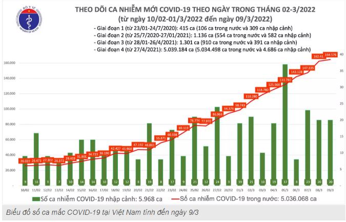 10/03/2022 01:12Ngày 9/3: Số mắc Covid-19 cả nước tăng lên 164.596 ca; Hà Nội lần đầu giảm sau nhiều ngày tăng liên tiếp