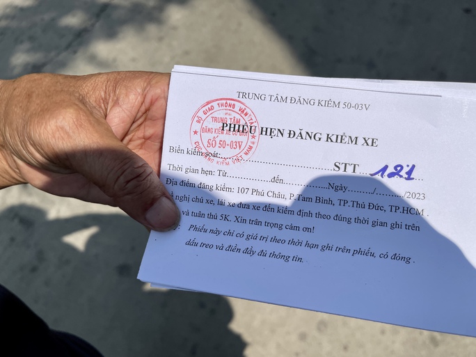 Theo ghi nhận, trong ngày đầu hoạt động trở lại, trung tâm đăng kiểm 5003V (tại phường Tam Bình, TP Thủ Đức) tiếp tục tổ chức phát phiếu hẹn in số thứ tự cho người mang phương tiện đến kiểm định. Đến trưa cùng ngày, phiếu phát ra đã lên đến con số 121.