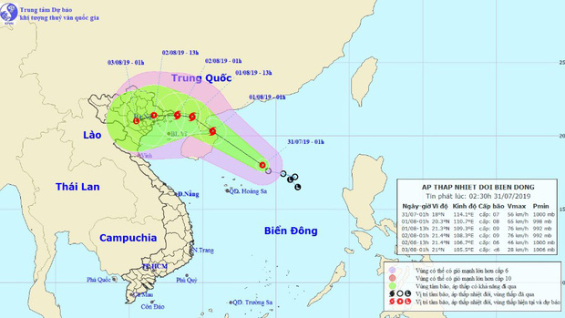 Theo Trung tâm Dự báo Khí tượng Thủy văn Quốc gia, hồi 1h ngày 31/7, vị trí tâm áp thấp nhiệt đới cách quần đảo Hoàng Sa khoảng 230km về phía Đông Bắc. Sức gió mạnh nhất vùng gần tâm áp thấp nhiệt đới mạnh cấp 7 (50-60km/giờ), giật cấp 9. Bán kính gió mạnh cấp 6, giật cấp 8 trở lên khoảng 100km tính từ tâm áp thấp nhiệt đới.