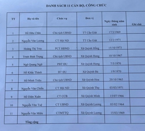 Nguyên 11 cán bộ, công chức cấp xã gồm: Chủ tịch UBND thị trấn Cầu Giát- Hồ Hữu Châu (SN 1969); Chủ tịch Hội nông dân thị trấn Cầu Giát- Nguyễn Văn Lương (SN 1971); Phó chủ tịch HĐND xã Quỳnh Hồng- Hoàng Thị Trúc (SN 1973); Chủ tịch UBND xã Quỳnh Hưng- Trình Bình Trọng (SN 1967); Phó bí thư Đảng ủy xã Quỳnh Hưng- Ngô Quang Ngữ (SN 1970); Bí thư Đảng ủy xã Quỳnh Bá- Hồ Khắc Thành (SN 1970); Chủ tịch UBND xã Quỳnh Hoa- Hồ Minh Triêu (SN 1965); Chủ tịch Hội nông dân xã Quỳnh Thọ- Nguyễn Văn Chiến (SN 1971); Chủ tịch Hội cựu chiến binh xã Quỳnh Minh- Hồ Diên Xuân (SN 1966); Chủ tịch UBND xã Quỳnh Lương- Nguyễn Văn Tuệ (SN 1964); Chủ tịch MTTQ xã Quỳnh Lương - Nguyễn Văn Miên (SN 1969).