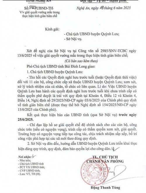Vào cuối năm 2024, trong đợt sáp nhập xã và tinh giản bộ máy, 11 cán bộ tại 8 xã của huyện Quỳnh Lưu đã làm đơn xin nghỉ hưu trước tuổi. Huyện sau đó đã ban hành quyết định cho các cán bộ này nghỉ hưu mà không báo cáo và xin ý kiến của UBND tỉnh Nghệ An. Sai sót này chỉ bị phát hiện gần đây khi tỉnh rà soát hồ sơ để giải quyết chế độ chính sách.