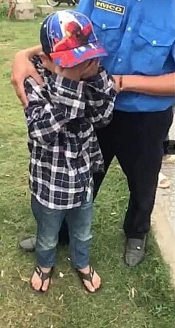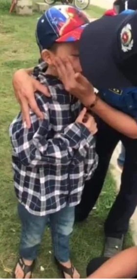 Có lẽ vì quá hoảng loạn, bé trai liên tục òa khóc. Chứng kiến cảnh này những người tại hiện trường không cầm được nước mắt. Một chiến sĩ thanh tra giao thông đã ôm bé và dỗ dành để bé ổn định lại tâm lý.