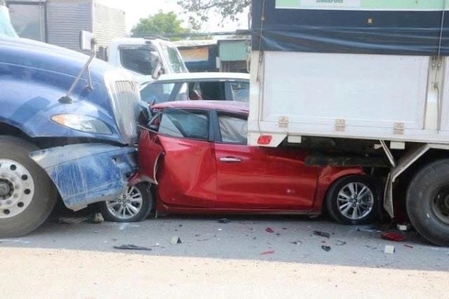 Lực đâm mạnh khiến chiếc xe nhỏ bị đẩy văng, kẹt chặt vào gầm một xe tải phía trước và va chạm thêm với một phương tiện khác. Tại hiện trường, chiếc xe 4 chỗ bị "vò nát", nằm gọn dưới gầm xe lớn trong tình trạng biến dạng hoàn toàn.