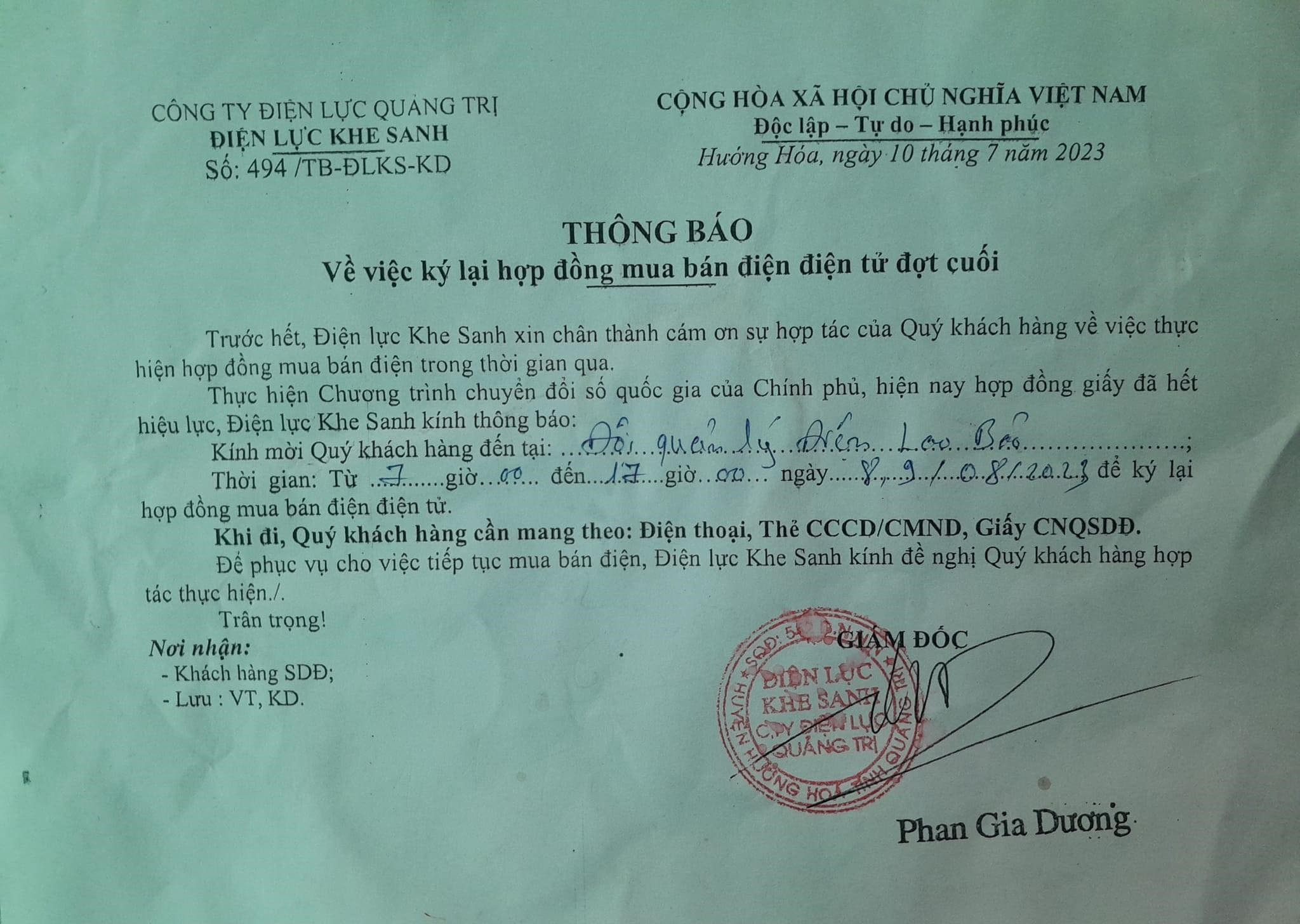 Phản ánh tới VietNamNet, một người dân cho biết, trước đó, hàng chục hộ dân trên địa bàn thị trấn Lao Bảo nhận được giấy mời của Công ty điện lực Khe Sanh (thuộc Công ty điện lực Quảng Trị) về việc, ngày 8 và 9/8/2023, người dân đến trụ sở đội quản lý điện Lao Bảo để ký lại hợp đồng mua bán điện điện tử.