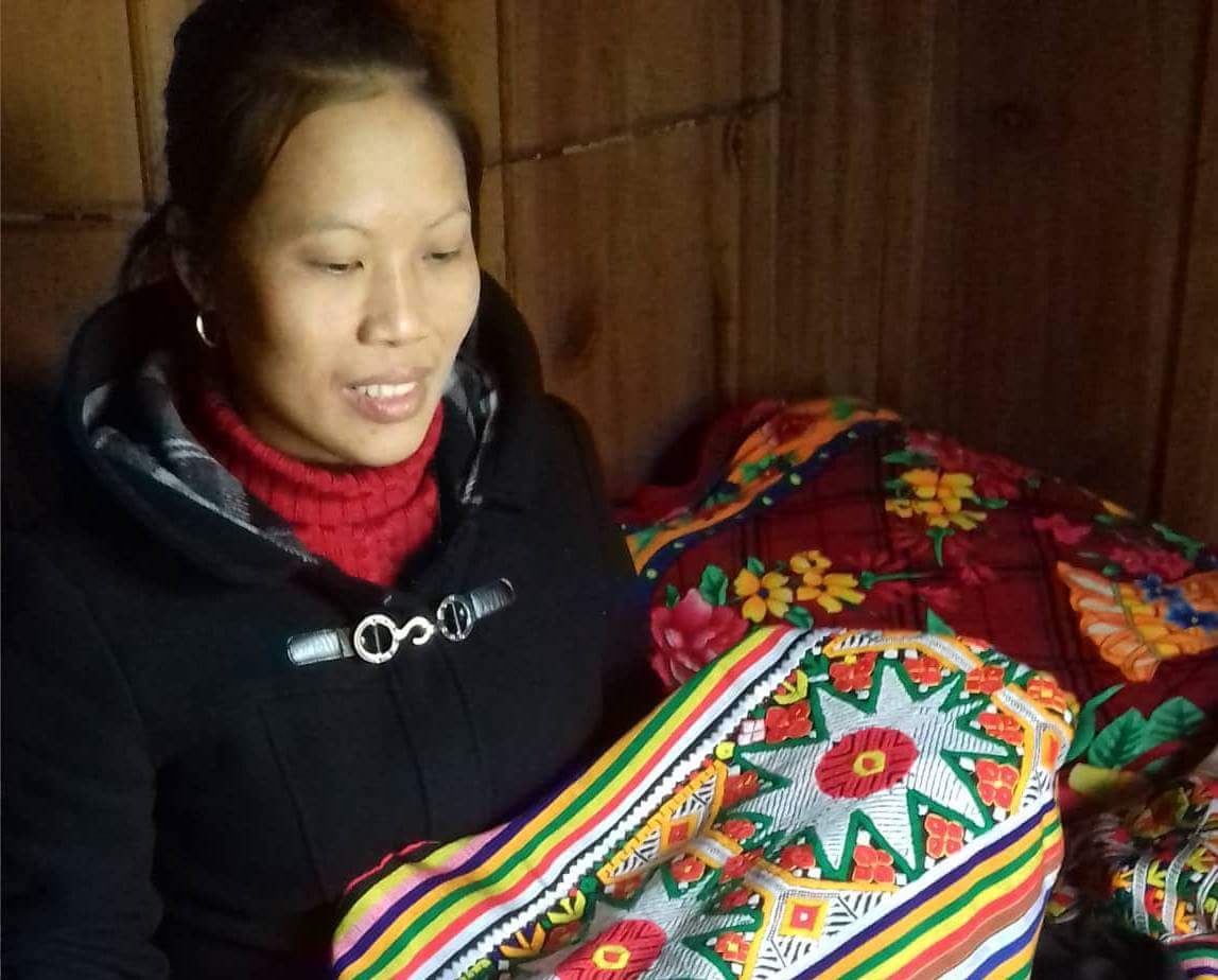 Với nghị lực của mình, chị đã tìm được một công việc thích hợp không phải di chuyển nhiều, đó là thêu áo váy thổ cẩm cho người Thái. Khéo tay cộng thêm sự chăm chỉ, mặt hàng của chị vừa làm ra là đã được đặt mua. Vì vậy, không những tự nuôi sống mình, mỗi tháng chị còn dư giả tích lũy một số tiền phòng những lúc ốm đau.