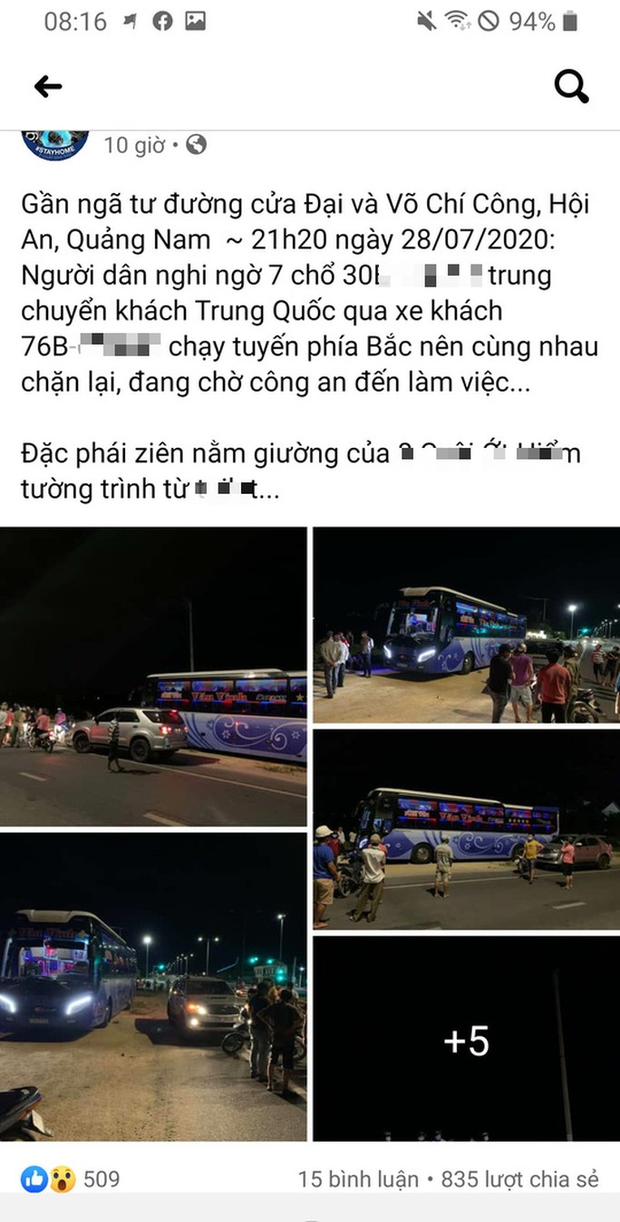 Trước đó, tối 28-7, một người dùng mạng xã hội Facebook đã đăng tải lên trang cá nhân của mình thông tin: Vào lúc 21 giờ 20 phút tối cùng ngày, tại ngã tư đường Cửa Đại - Võ Chí Công (TP Hội An), người dân địa phương phát hiện một xe ô tô 7 chỗ ngồi trung chuyển người qua xe khách mang biển số tỉnh Quảng Ngãi, chạy tuyến phía Bắc. Nghi ngờ xe này chở người Trung Quốc nên người dân cùng nhau chặn lại, báo công an đến làm việc.