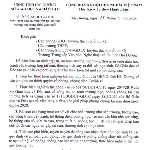 Công văn Sở GD&ĐT tỉnh Hải Dương về việc đảm bảo an ninh trật tự, an toàn trường học trong thời gian cuối năm học. Ảnh: Đ.Tùy
