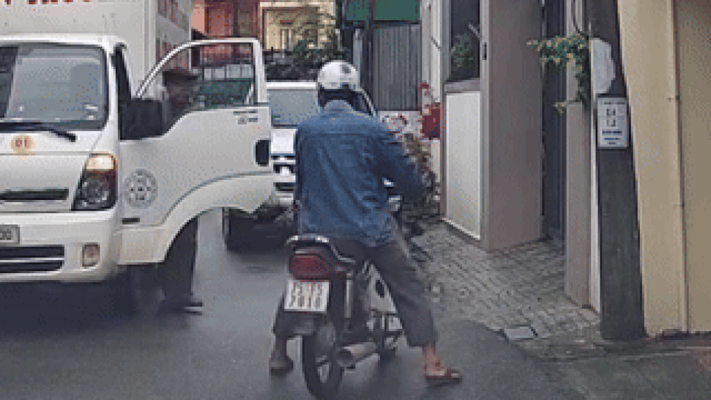 rong khi tài xế xe bán tải nhanh chóng hợp tác và lùi phương tiện, tài xế xe tải lại tỏ ra hung hăng, thậm chí rút ra vật giống hung khí để đe dọa và tấn công người đàn ông đi xe máy.