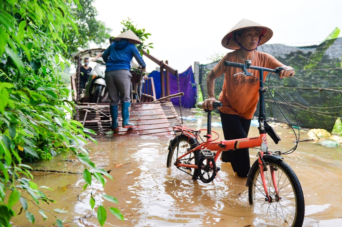 Mực nước dâng cao, gần như cắt đứt con đường đi lại hàng ngày của người dân nơi đây, buộc toàn bộ phải đi đò nếu muốn ra vào khu vực bãi giữa sông Hồng.