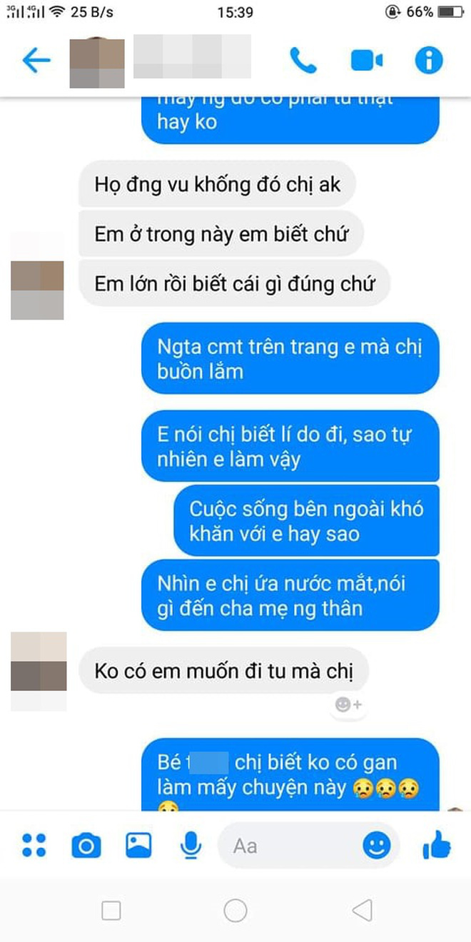 Đặc biệt, trong phần tin nhắn trao đổi với W.Q. trước đó, cô gái tên T. đã lên tiếng cho rằng những thông tin về Tịnh thất Bồng Lai ở trên MXH đều là vu khống bởi "em sống trong này em biết chứ". Bên cạnh đó, T. cũng khẳng định, "Em lớn rồi em biết cái gì đúng chứ. Em muốn đi tu mà chị...".