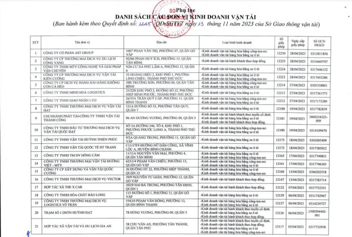 21 nhà xe này chủ yếu đăng ký kinh doanh xe hợp đồng, chở khách tuyến cố định, vận tải hàng hóa bằng container, đều được cấp giấy phép từ tháng 4/2023.